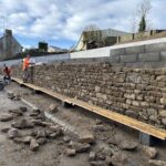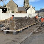 L’entreprise ID VERDE construit le mur en pierre qui va clôturer ce parking :